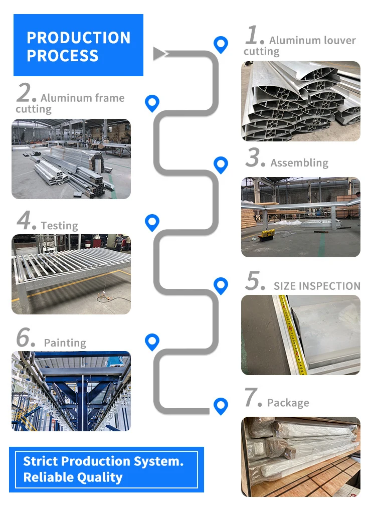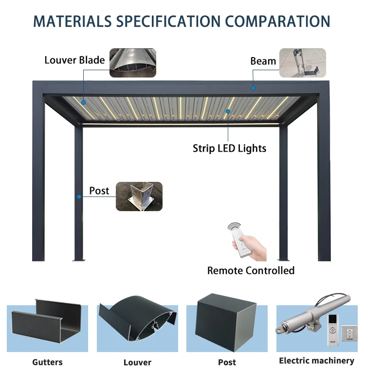 Materials Details | 1,Post: aluminum alloy 6063 T5 2,Blades : aluminum alloy 6005 T5 3,Beams: aluminum alloy 6063 T5 4,Gutter :100x100x2mm colors can be customized | ||||||