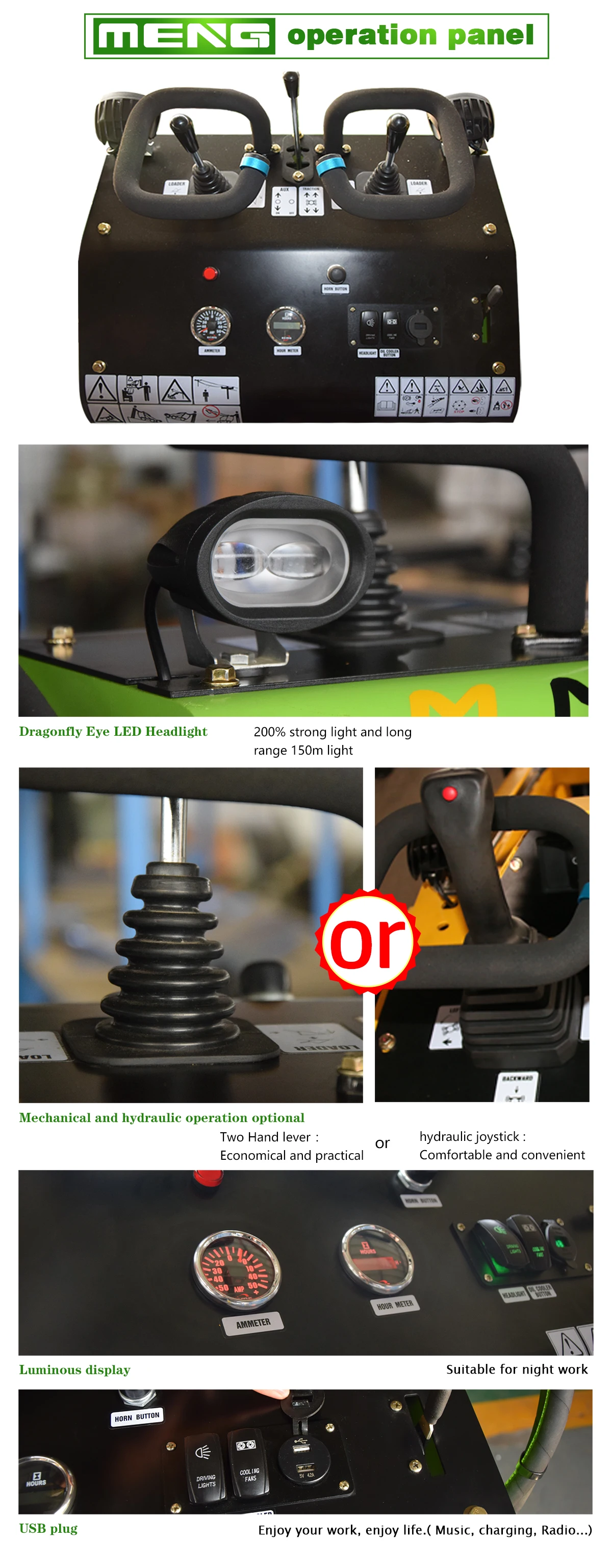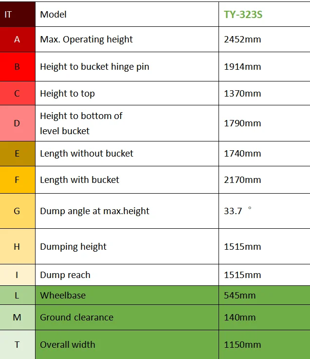 1 - TY-323S mini wheel loader is an excellent tool in tight sports like inside buildings or compact roadways where bigger machines cannot go. 2 -The combination of a powerful America engine and motor, Italy pumps, and other quality parts helps you to lift more than TY-323S listed. 3 - The four wheels design type is going to be fast ground travelling even can upt 6km/h, circle working time in shorten to get high working efficiency on garden cleaning, trenching, landscaping, etc depending on the job site..4 -1370mm total height, working stand up on the back, it has a wide wide view