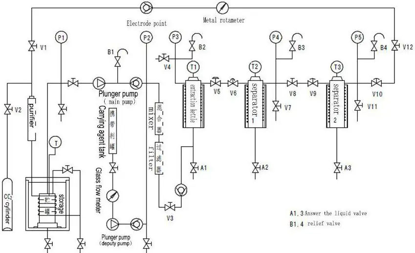 The technology of SFE(Supercritical Fluid Extraction) is a new subject from Modern Chemicals Industries, which is one of the advanced Separation Technology. As for SCF(Supercritical Fluid), it is was that fluid on Critical Point(Pc, Tc) under Thermodynamic State, the Critical Point is the state point when interface of Gas and Liquid disappear, which process very novel physical& chemical characters. It density degree close to liquid, viscosity degree close to gas, but bigger diffusion coefficient &dielectric constant, smaller viscosity etc. these characters have contributed to good separation effects. So the SFE is mainly about Separation, the solution will touch with extracted materials under High Pressure& Suitable Temperature, the Solutes would be diffused into the solution, then change the operation Conditions, to make the Solutes separate out.