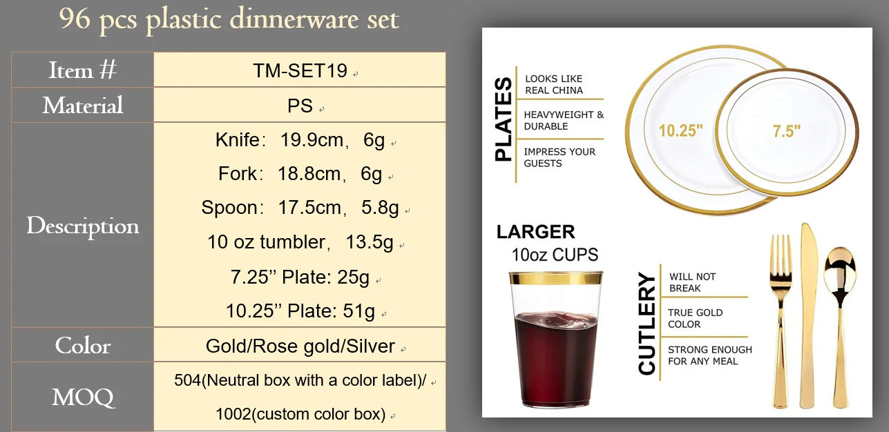 Product Name | 16 Person Camping Plastic Tableware Set Gold Dinner Set Dinnerware Party Gold Cutlery Set with Paper Napkin | Item NO. | TM-SET20 |