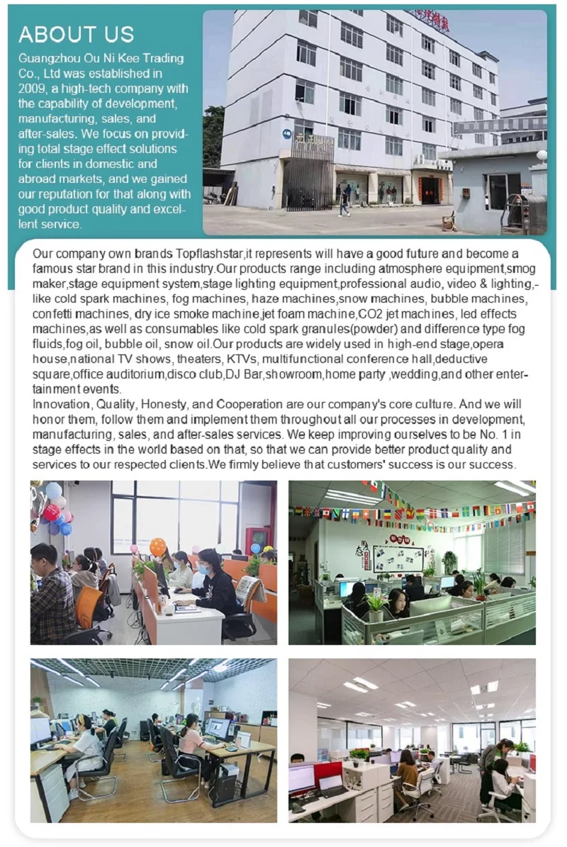 Our company own brands Topflashstar,it represents will have a good future and become a famous star brand in this industry.Our products range including atmosphere equipment,smog maker,stage equipment system,stage lighting equipment,professional audio, video & lighting,like cold spark machines, fog machines, haze machines,snow machines, bubble machines, confetti machines, dry ice smoke machine,jet foam machine,CO2 jet machines, led effects machines,as well as consumables like cold spark granules(powder) and difference type fog fluids,fog oil, bubble oil, snow oil.Our products are widely used in high-end stage,opera house,national TV shows, theaters, KTVs, multifunctional conference hall,deductive square,office auditorium,disco club,DJ Bar,showroom,home party ,wedding,and other entertainment events.