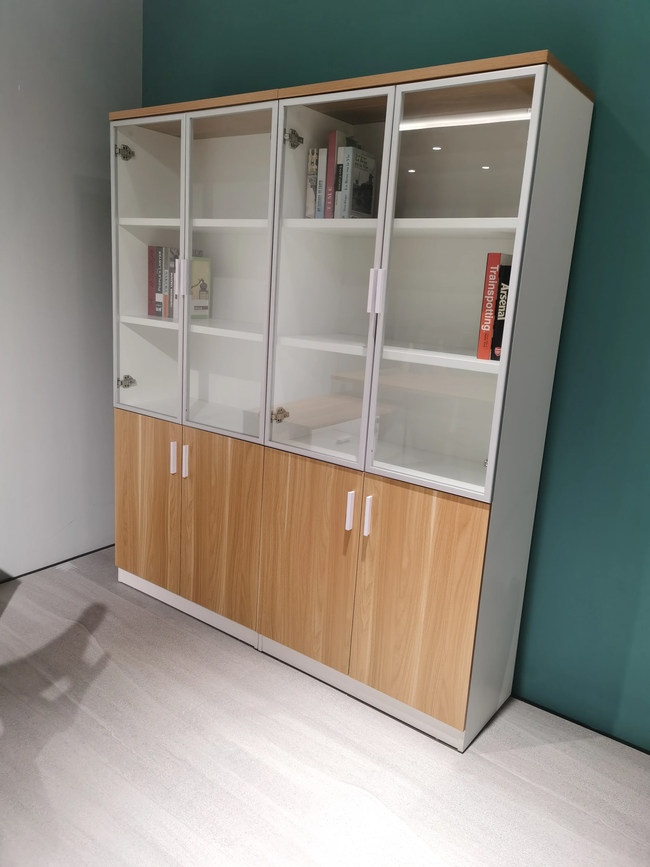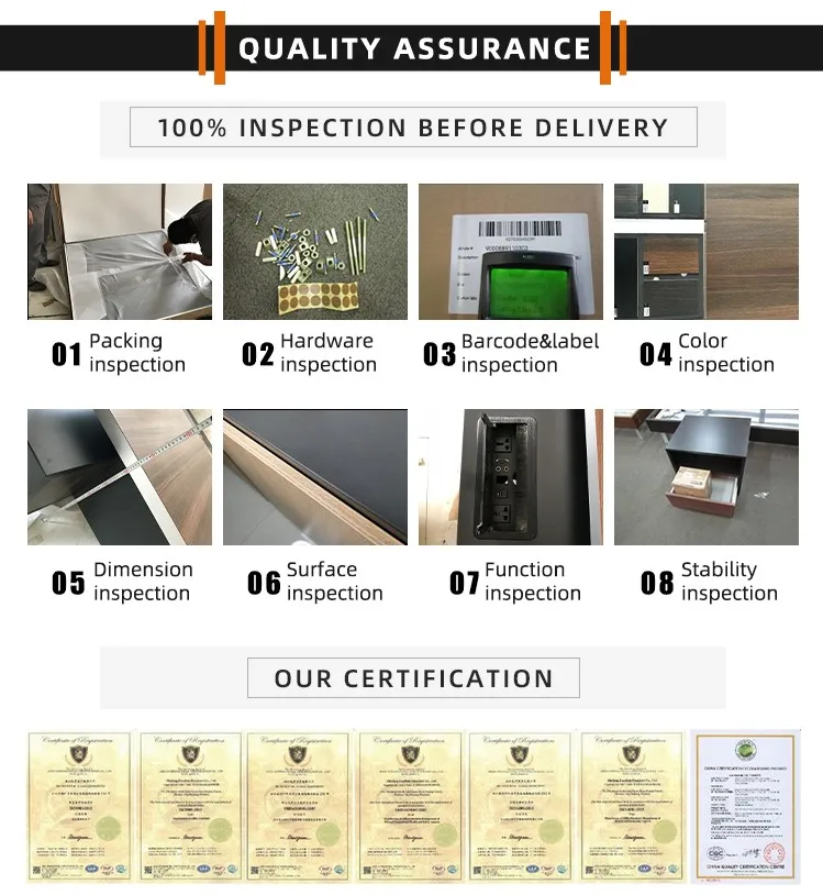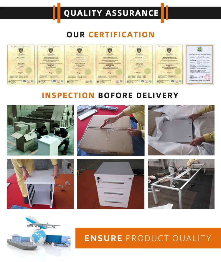 Specification: | 1.Material: E1 grade environmental friendly particle board with melamine finished. 2.White square powder coated legs. 3.The side storage includes drawers, soft close door, open space shelf. 4.Including wire management with wirebox.. 5.Storage direction can be produced at left side or right side. 6.Including modern shaped modesty panel. |