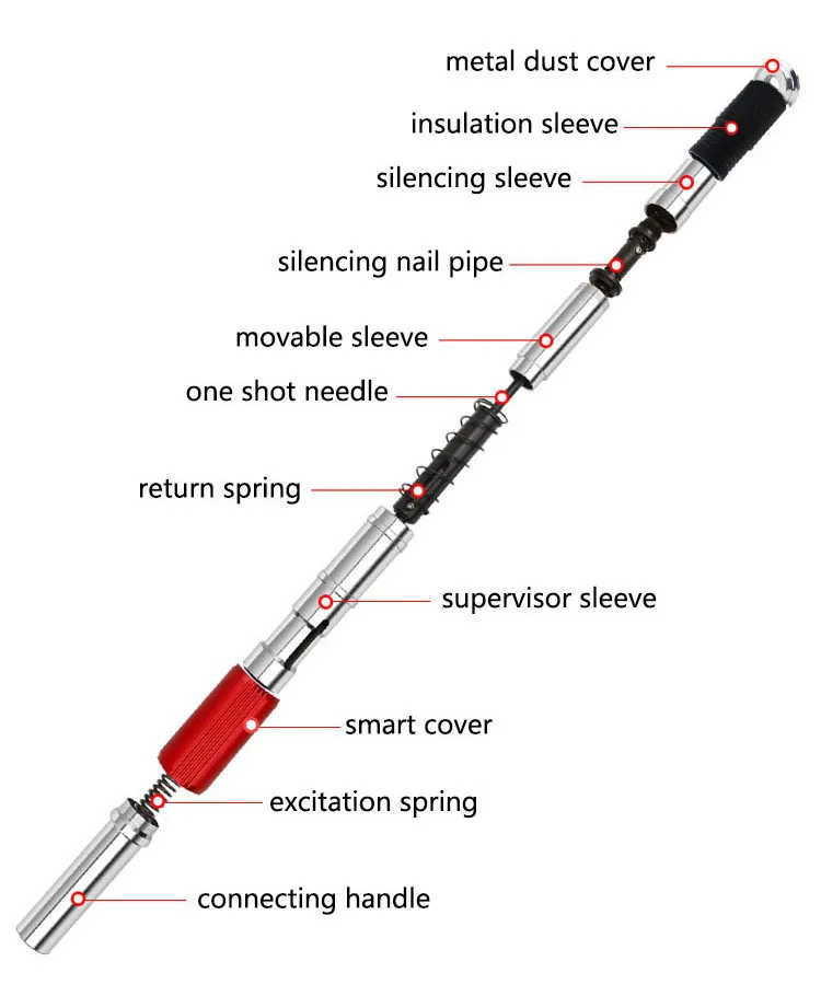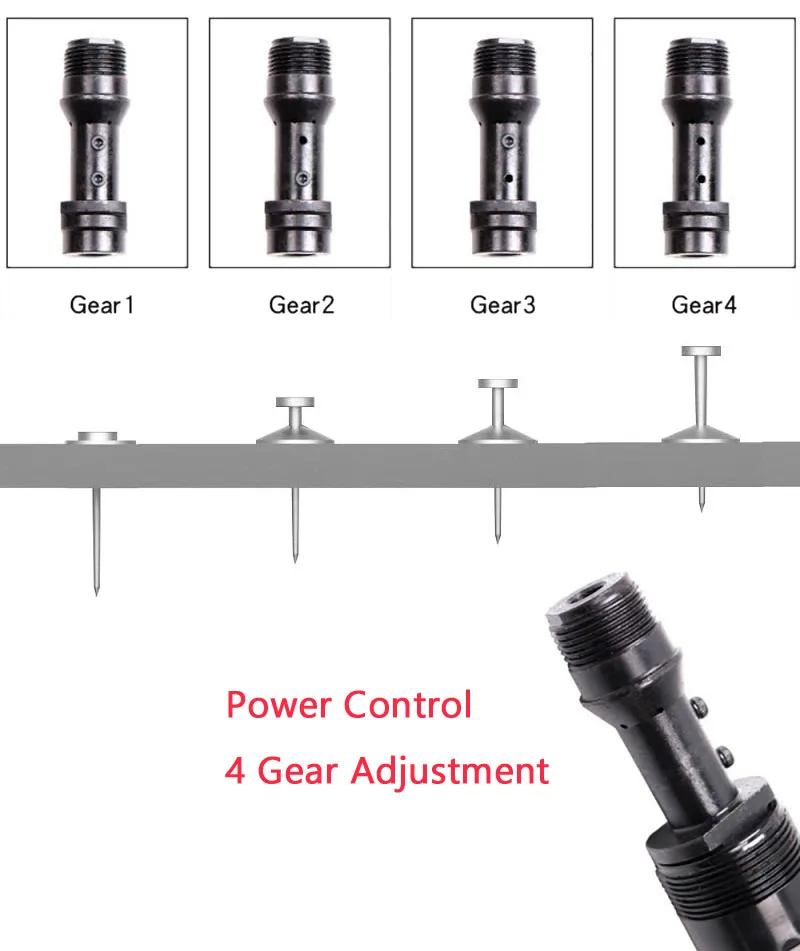 Length: 42cm Extension rod length: 5 * 60cm Nail length: 32-57mm Scope of application: Integrated ceiling, tooling ceiling, keel ceiling, waterline pipe installation, bridge installation, various types of fastening construction Function: silencer + 4 modes adjustment + automatic slag discharge Color: as show