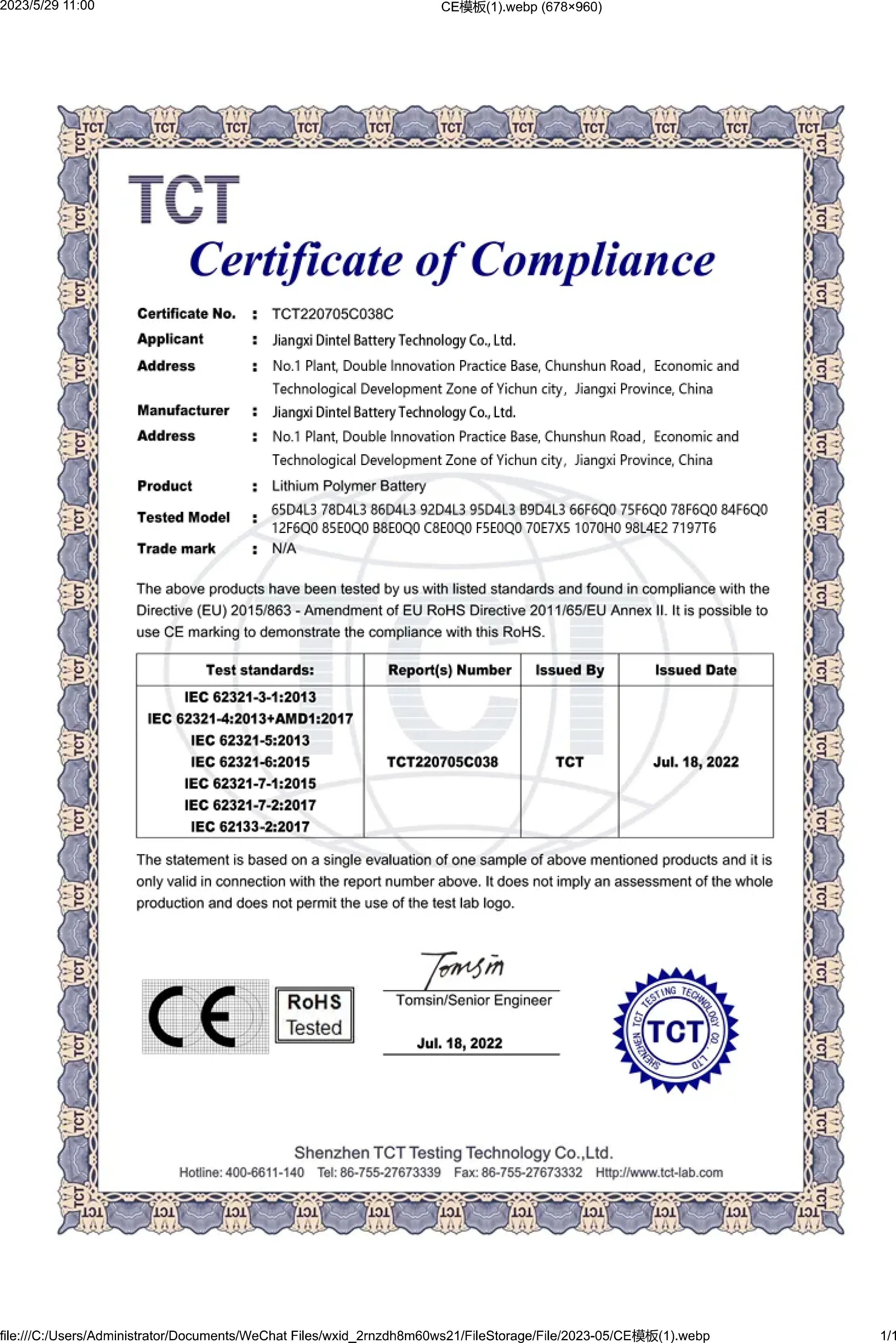 Temperature Cycling | Fully Charged | Reducing the chamber temperature to -40℃ within 60 minutes and maintaining this temperature for 90 minutes, Raising the chamber temperature to 25 ℃ within 60minutes, Raising the chamber temperature to 85℃ within 90minutes and maintaining this temperature for 110 minutes, Reducing the chamber temperature to 25℃ within 70minutes. Repeating the sequence for a further 4cycles, Observe 1 hour | NO EXPLOSION AND NO FIRE. |