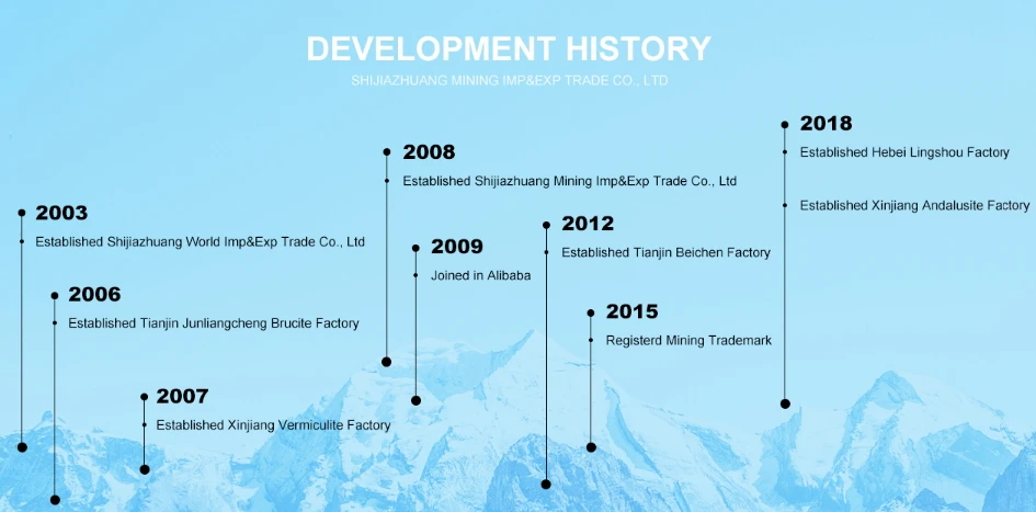 Shijiazhuang Mining Imp & Exp Trade Co., Ltd . established in 2008 , and owns the sepiolite mine and the vermiculite mine and andalusite mine. three processing factory is built in in tianjin , hebei and xinjiang the main product contains andalusite,steel fiber, sepiolite, vermiculite,brucite , mica , zeolite , lava stone.perlite etc.they are widely used in the various fields ofindustry agriculture and construction.