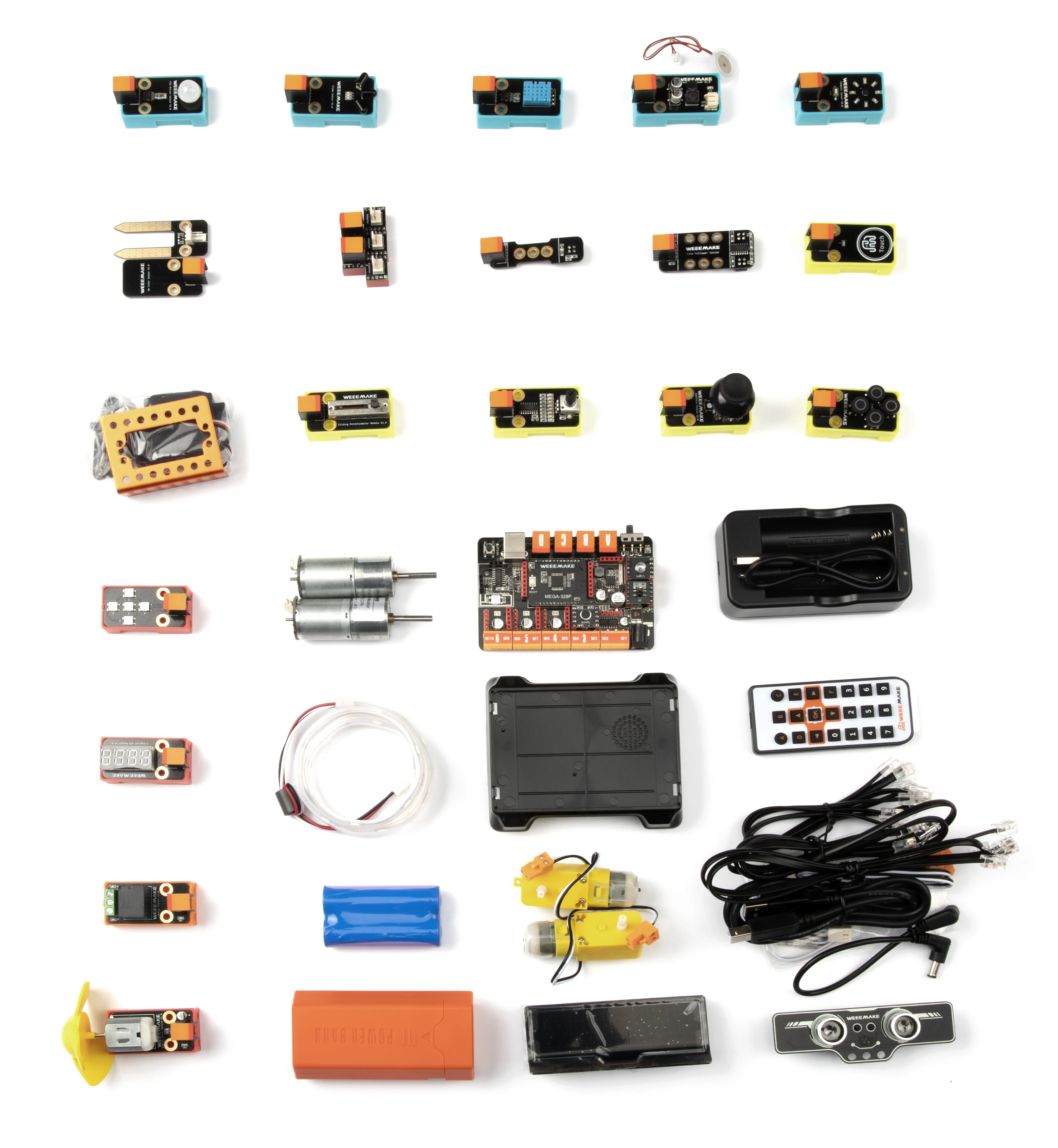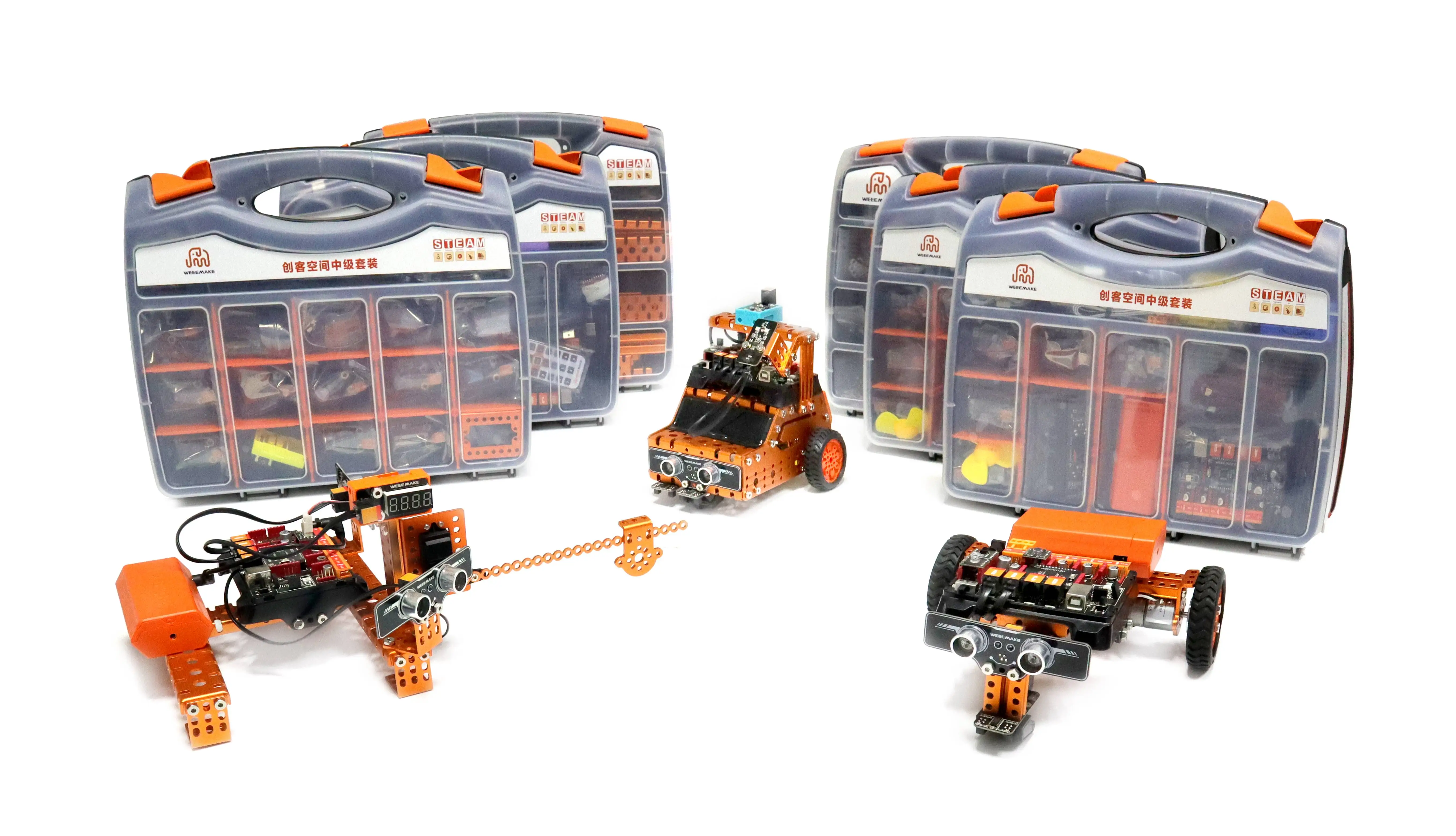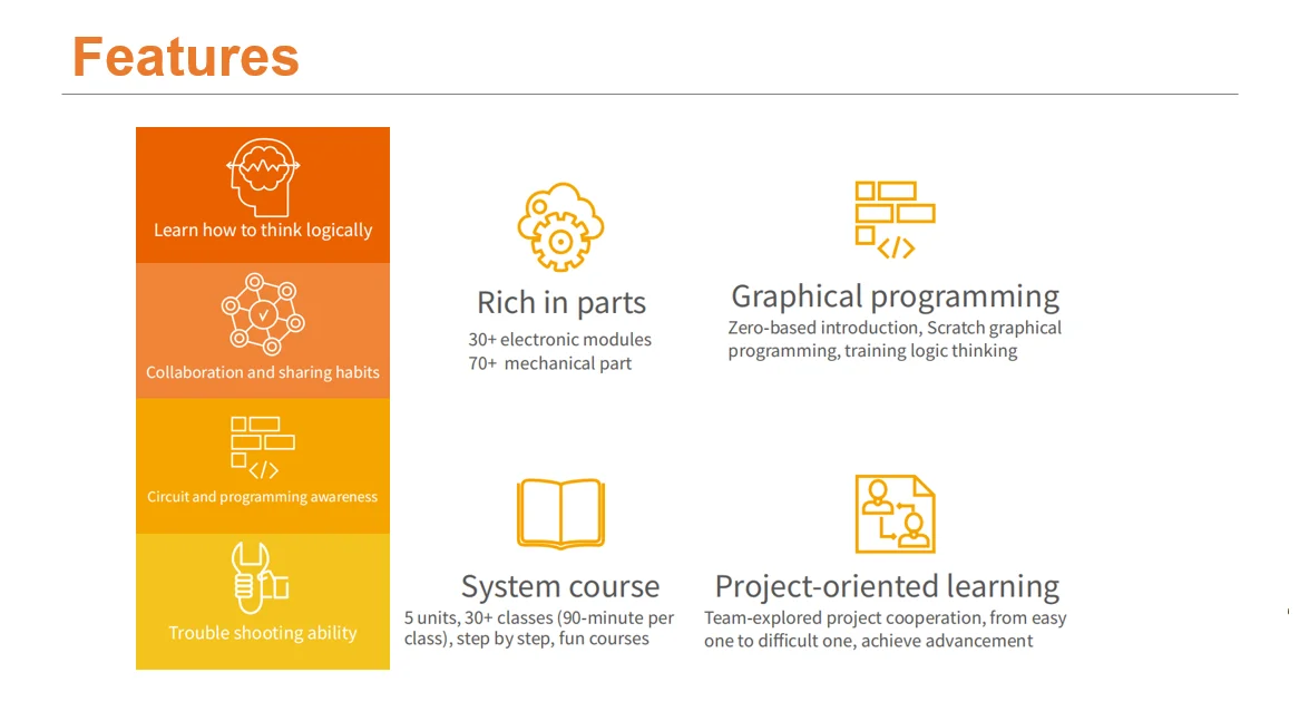 Advanced Maker Space Kit is a teaching product based on STEAM education concept, which integrates mechanical parts, electronic modules, software and courses. This kit is mainly used to learn electronic and programming related knowledge. The kit consists of 30+ electronic module types. The course is categorized by project units, focusing on the principles and programming usage of electronic modules, complemented by project construction with creative ideas.