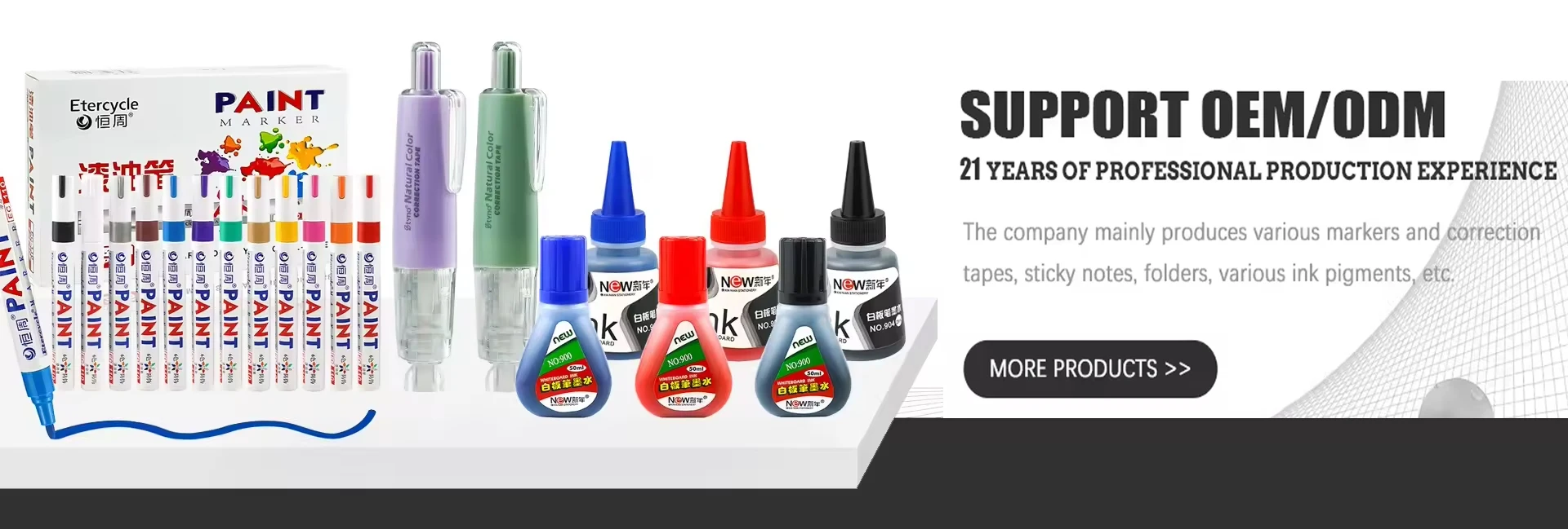 Shantou Rongpai stationery Co,Ltd. was established in 2004 and is a stationery super factory that integrates research and development, production,and sales. The company mainly produces various markers and correction tapes, sticky notes,folders, various ink pigments,etc. All products comply with European and American testing standards, and the company has passed factory inspections such as ISO9001,SEDEX, BSCl, etc. Rongpai stationery fully leverages the advantages of its products, keeping in mind its mission of making the world colorful, adhering to the values of professional innovation, gratitude, friendship, and integrity for win-win,committed to becoming the "aristocrat" of the stationery product industry, meeting customer customization needs, improving product value and market competitiveness.