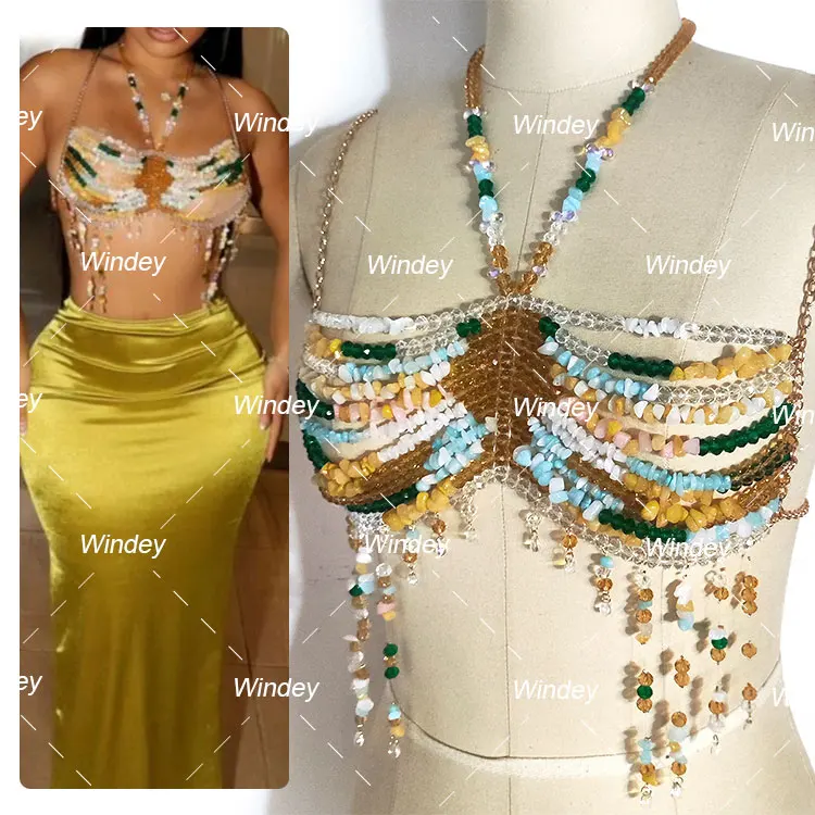 Latest Fashion Sexy Beach Music Festival Gemstone Halter Vest Halter Hollowed Body Chain Beaded Vest Top Bras $17.50-19.00