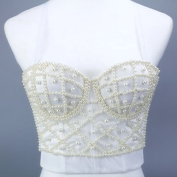 Handmade Jewelry Alloy Pearl Beads Body Chain Fancy Crop Top Full Figure Long Line Posture Bra Top $6.49-8.50