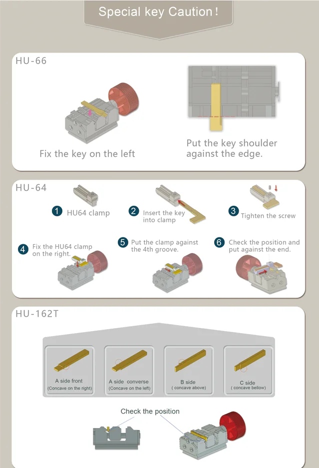 6. Every machine has multi-functions standard clamp, it can fix laser key ,standard(flat) key, HU162T,TOY2 and other especial