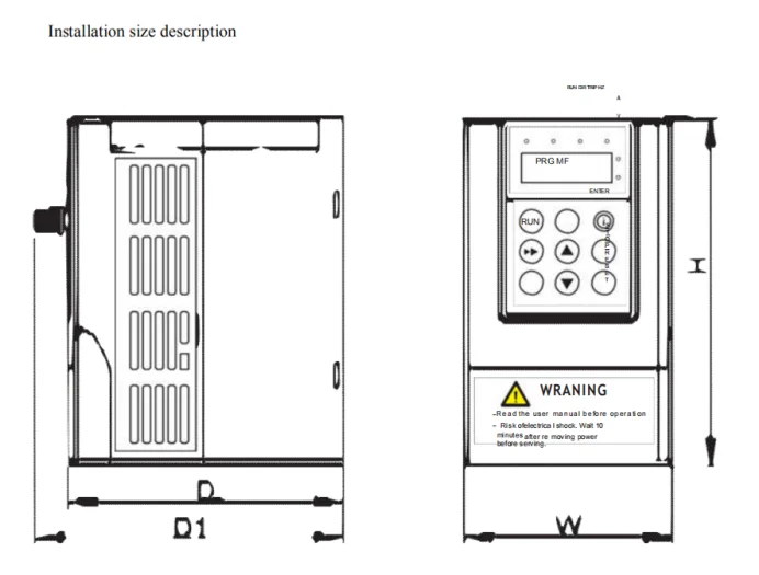 Input/Output Voltage | Power (KW) | Output current (A) | W (mm) | H (mm) | D (mm) | D1 (mm) | Mounting aperture (mm) |