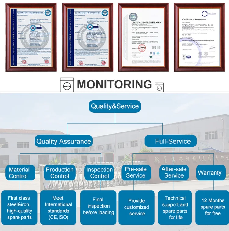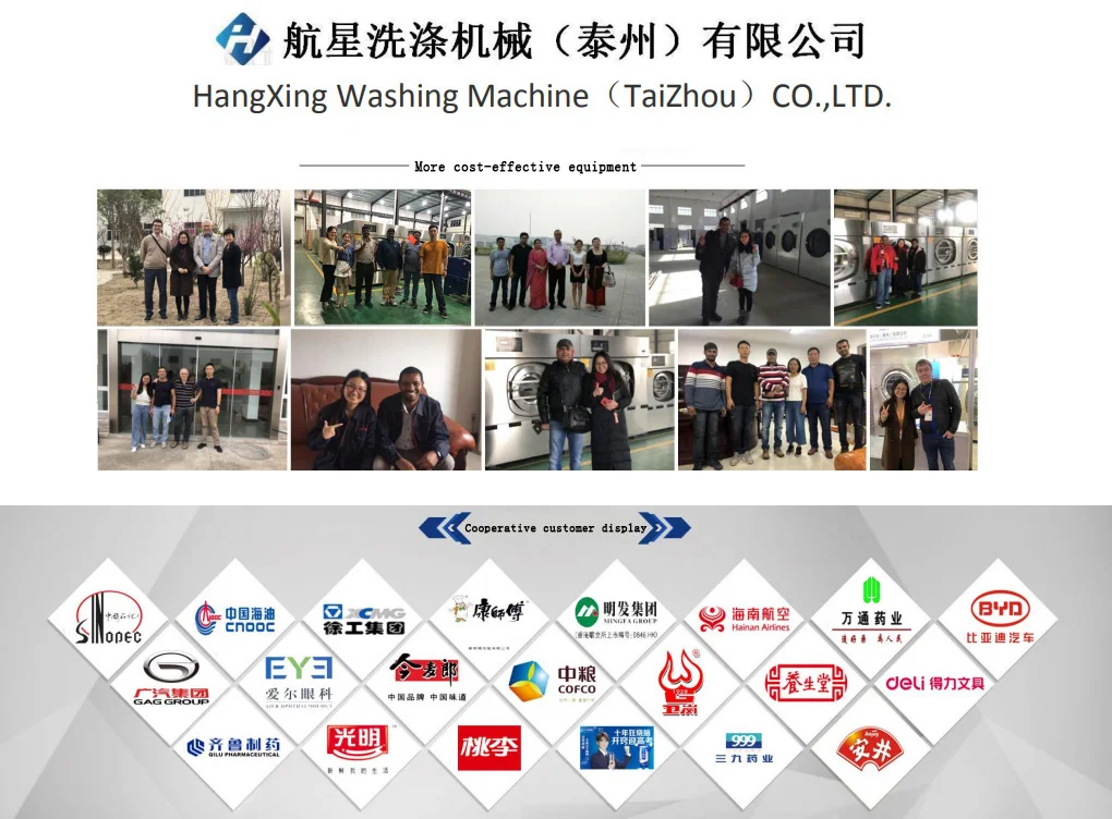 Hangxing washing machine(Taizhou) Co., Ltd is founded in 2006, located in Taizhou economic development zone. The factory covers a floor area of 4 0,0 0 0 square meters, building area of 1 5, 0 0 0 and with about 1 3 0 workers. After 17years development, we have been a High-Technology enterprises combines scientific research,design, creation, marketing and service as one. Our factory mainly produces laundry machines: washer extractor, barrier washer extractor, industrial washing machine, hydro extractor, tumble dryer, flatwork ironer, folding machine, dry cleaning machine, finishing equipment and so on. The products are popular in hotels, restaurants, hospitals, schools, railways, airports, troops and so on. We have import and export licence, I S O 9 0 0 1 certificate and CE certificate. Meanwhile, we attend some exhibitions in China and overseas each year, like Canton Fair, China International Laundry and dyeing industry exhibition etc. Due to excellent product quality, rapid after-service and good reputation, our machines are not only in great demand in domestic, but also exported to more than 130 countries all over the world. For example: USA, Canada, Britian, Spain, Russia, Chile, Mexico, Malaysia, Vietnam, South Africa etc.