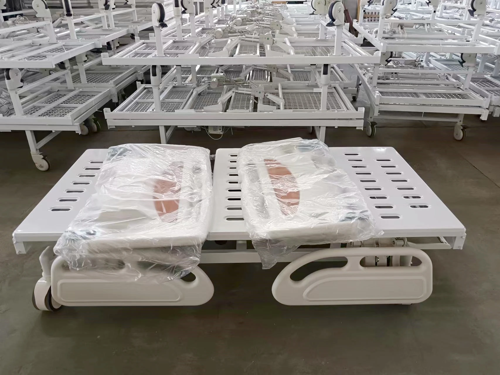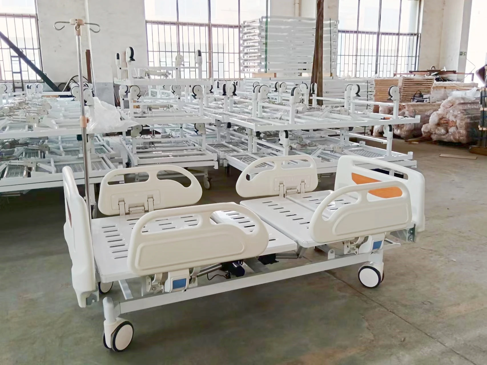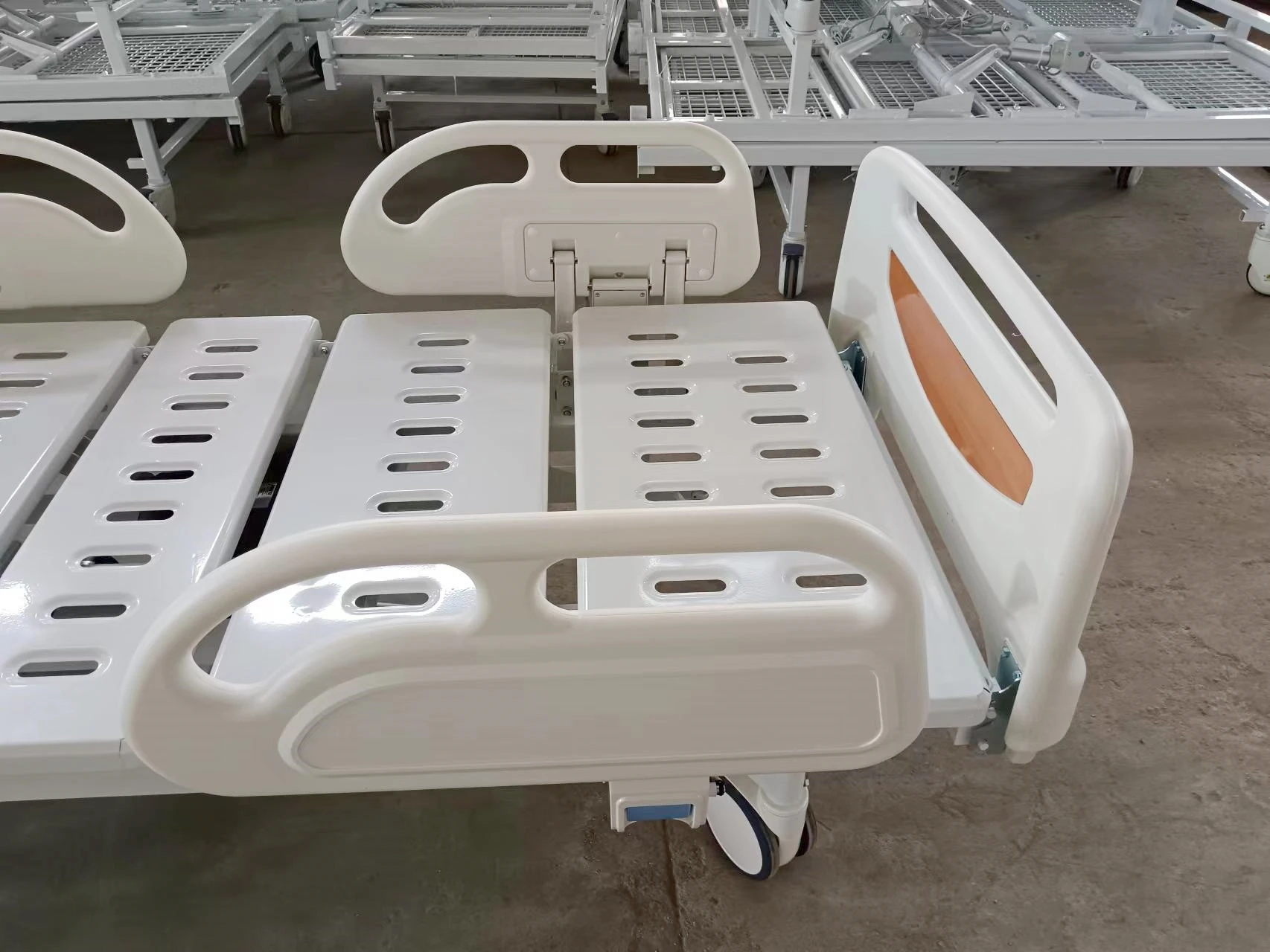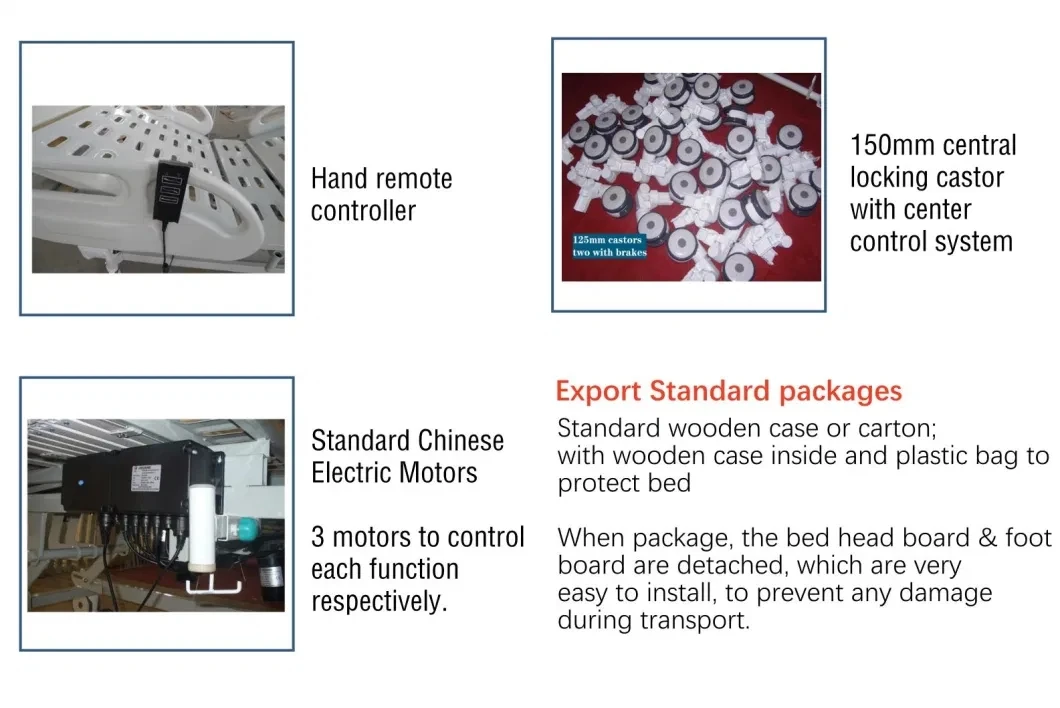 Standard Accessory ABS head/end bed board----------1 pair Foldway ABS side rails guards----------2 pair 150mm high quality centrol lock castors----------4 PCS I. V. Drip holes----------4 PCS Telescopic stainless steel IV drip pole with 4 hooks Optional Overbed table Bedside cabinet lockers 6cm/8cm/10cm bed mattress