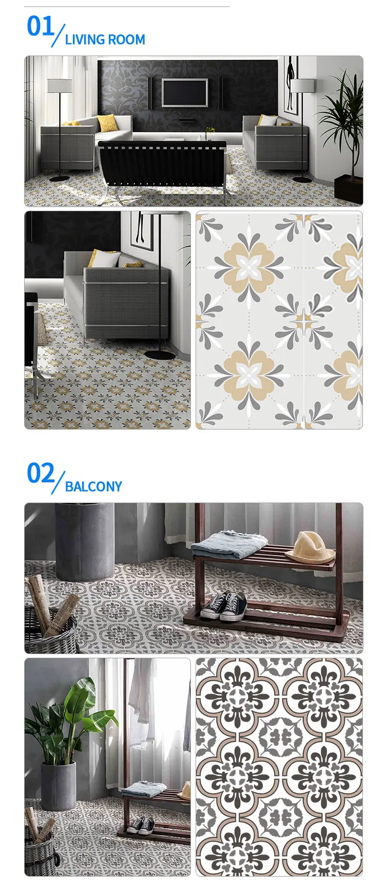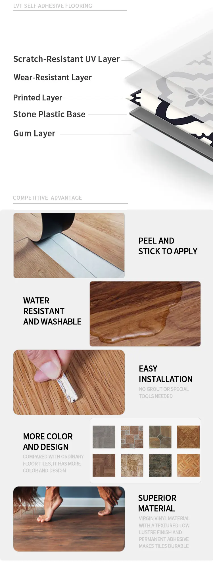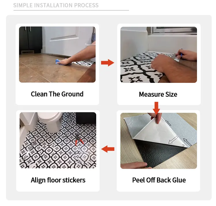 Feature | Water resistant and washable | Application | Easy DIY, peel and stick on floor |