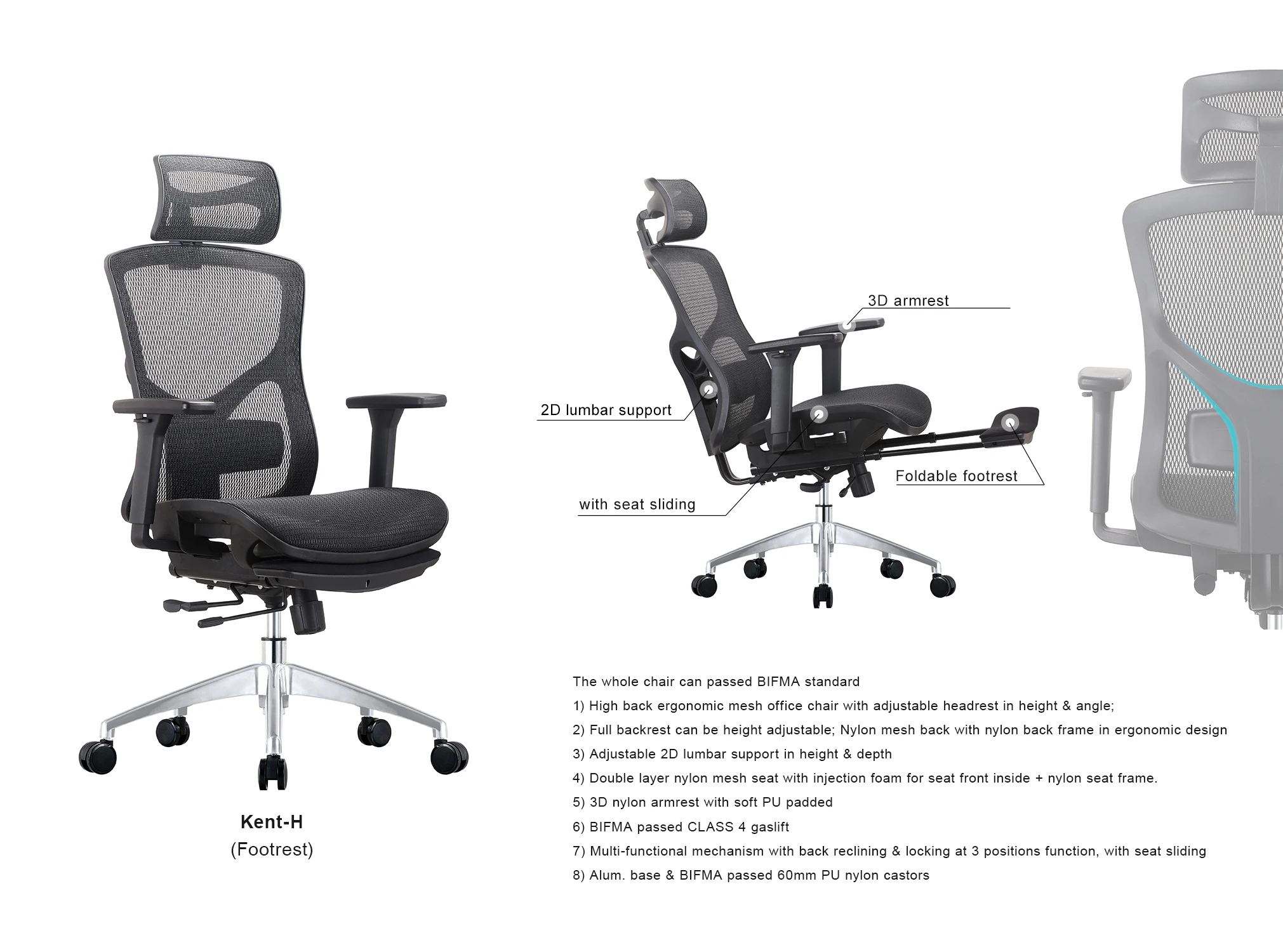 Base | Aluminium /Nylon/Chrome | Pass BIFMA 1136kgs static pressure test | 5 years warranty |