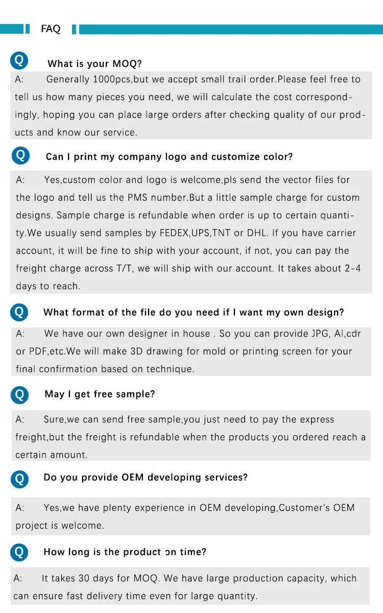 MOQ: | 1000PCS OR customized quantity as disscussed | ||||