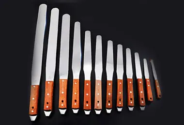 Product name: Stainless steel inking knife. Material: Stainless steel. Size: 4(small)/ 4(larger)/ 5/ 6/ 7/ 9/ 10/ 12/ 14/ 16/ 18inch,ect. Application: 1kg Stir proofing of ink glue / Wash mesh screen/ Pry open the iron bucket lid. Package: In carton.