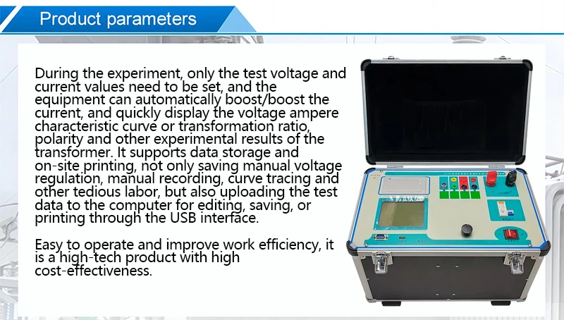 4. It can detect the volt ampere characteristics, transformation ratio, polarity, 5% and 10% error curves, CT primary flow, CT demagnetization and other items of CT/PT, so as to easily realize multiple uses of one machine.