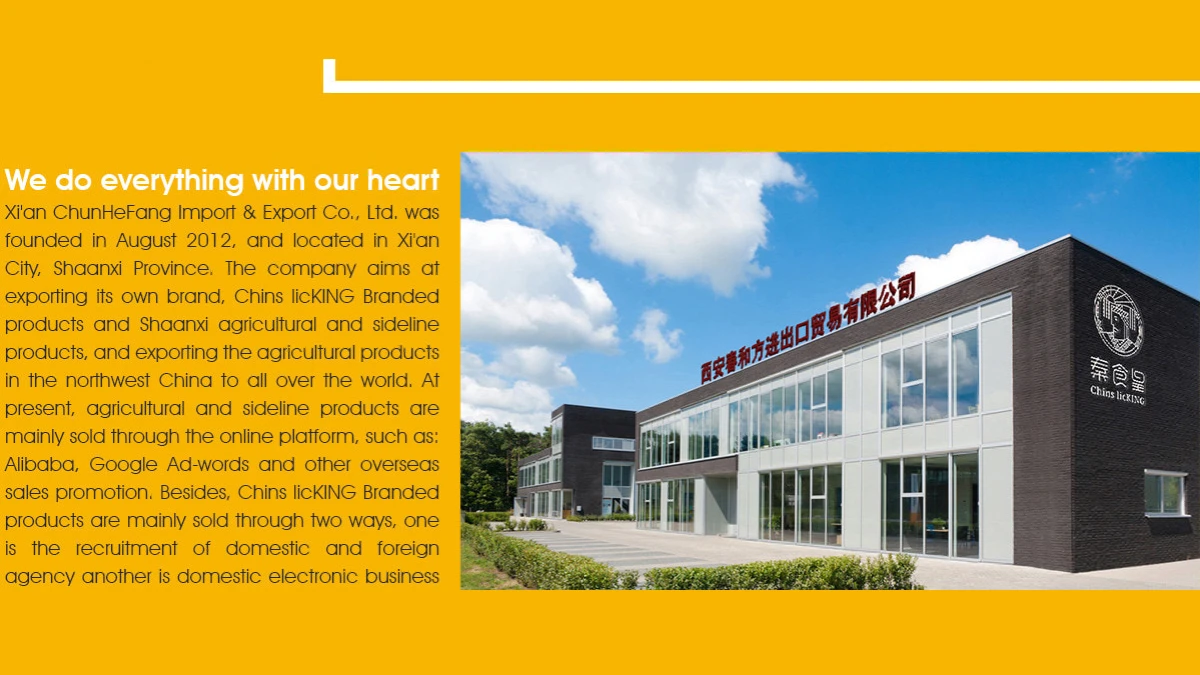 Xi'an ChunHeFang Import & Export Co., Ltd. was founded in August 2012, and located in Xi'an City, Shaanxi Province. The company aims at exporting its own brand, Chins LicKING Branded products and Shaanxi agricultural and sideline products, and exporting the agricultural products in the northwest China to all over the world.Chins LicKING Branded products are mainly sold through two ways, one is the recruitment of domestic and foreign agency another is e-commerce platform. At present, Cross-border e-commerce E-commerce platforms mainly include Alibaba, Amazon and Google.