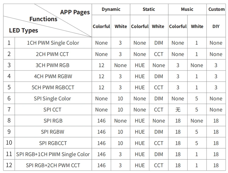 8. 5 major control pages in the App: dynamic, static, music, custom and setting; select difffferent types of LED correspond to difffferent App page content, as follows: