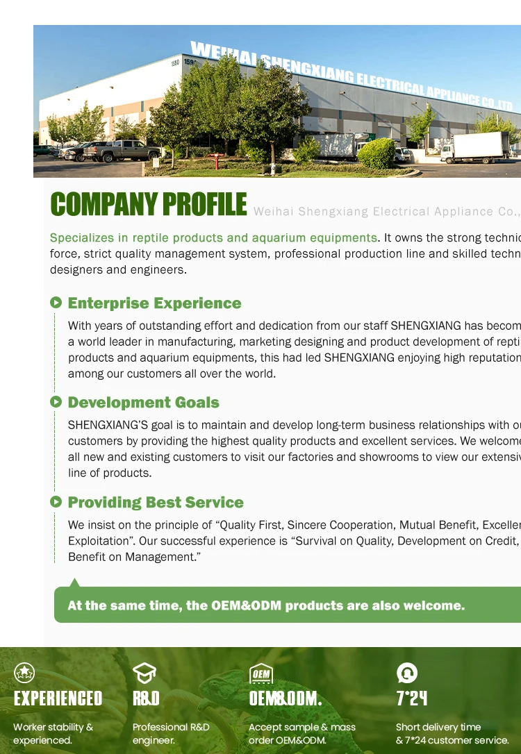 A: Are you a production plant? B: We are a professional Reptile products and Aquarium Equipments manufacturer factory A: Can I print my logo on the product? What is the cost? B: Yes, logo printing is available. We are good at OEM.You just provide us the design of the logo. We will give you the suggestion of the size and the solution. A:Can we provide sample? B:Yes , we can provide sample. Please contact with us ! A: What kind of packing do you have? B: Color Box + Inner Packing + Standard Export Outer Carton,We can also design the packing style and logo according to your requirements. A: What is the payment? B: Payment Term: T/T. Also we accept the L/C, Western Union and Alibaba Trade Assurance Order.