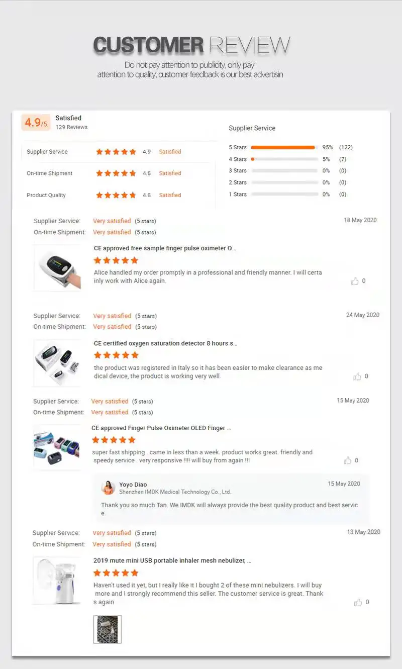 IMDK is committed to developing innovative beauty and medical health products for global medical institutions and family support .In line with its core mission of "Care health,Joy life" we have always sought to innovate and grow.Our main products is Pulse Oximeter and non-contact infrared thermometer, The company has created a wealth of experience in sales and after-sales service team. Manufacturers and users in the formation of a very high reputation.