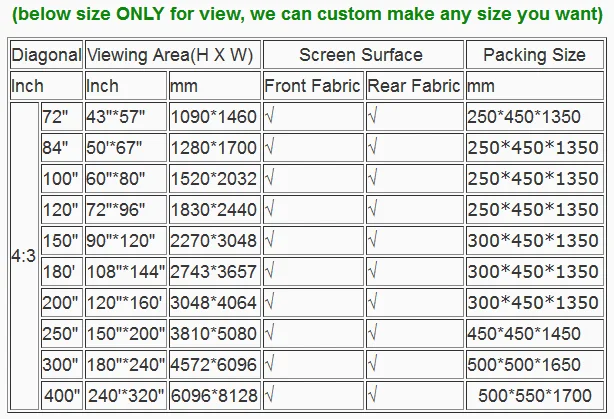 Size | 72"-400" |