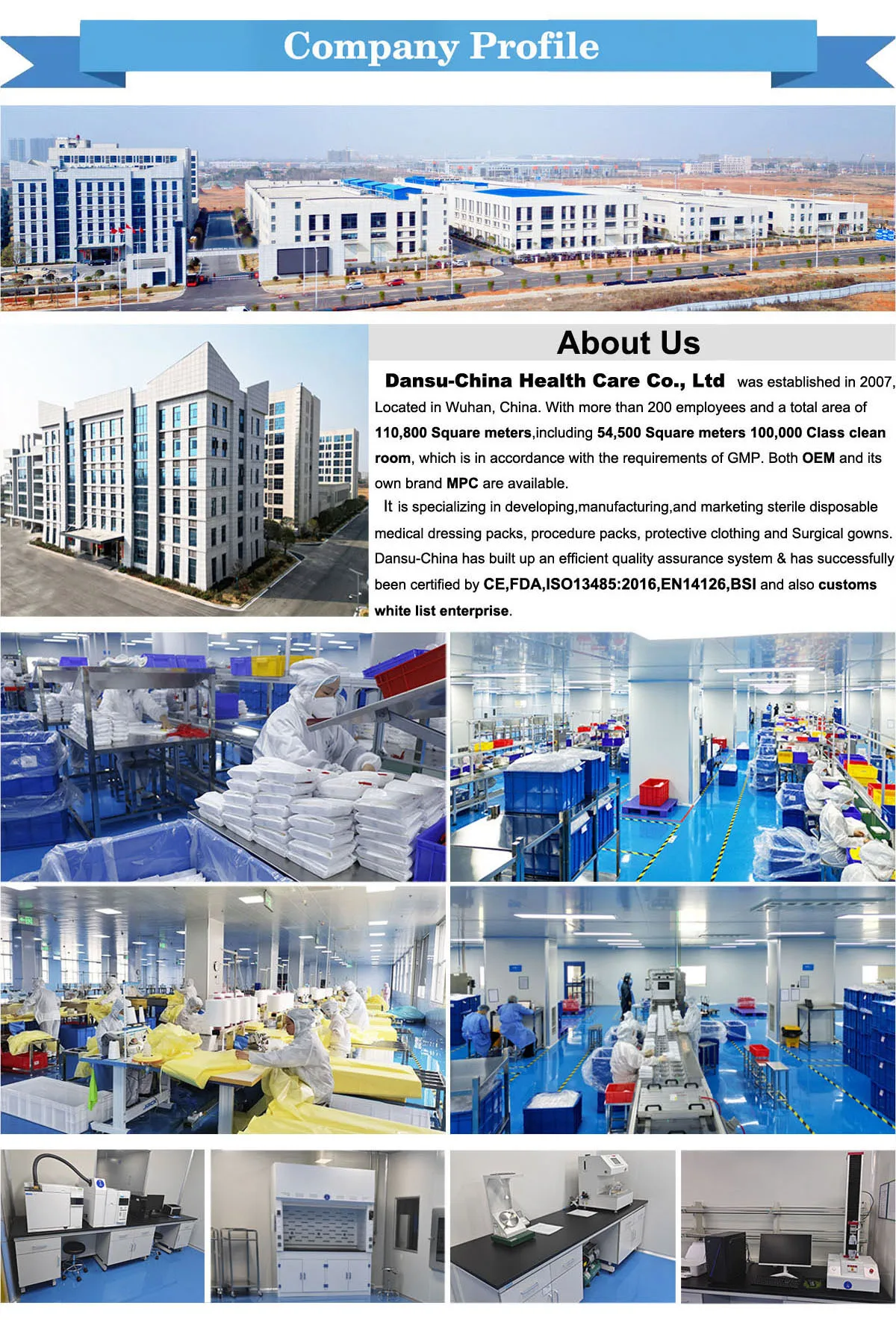 Q6. Tell me about your company?Because I want to buy medical cotton products and medical dressing set? A: we have more than 100 workers, 58500m2 factory, with 100,000 class clean room, non-dust workshop ,12 years experiences, ISO, CE certificates. We have professional OD team and strict quality control system. We dedicated to provide our customers faultless pre-sales service and after-sales service.