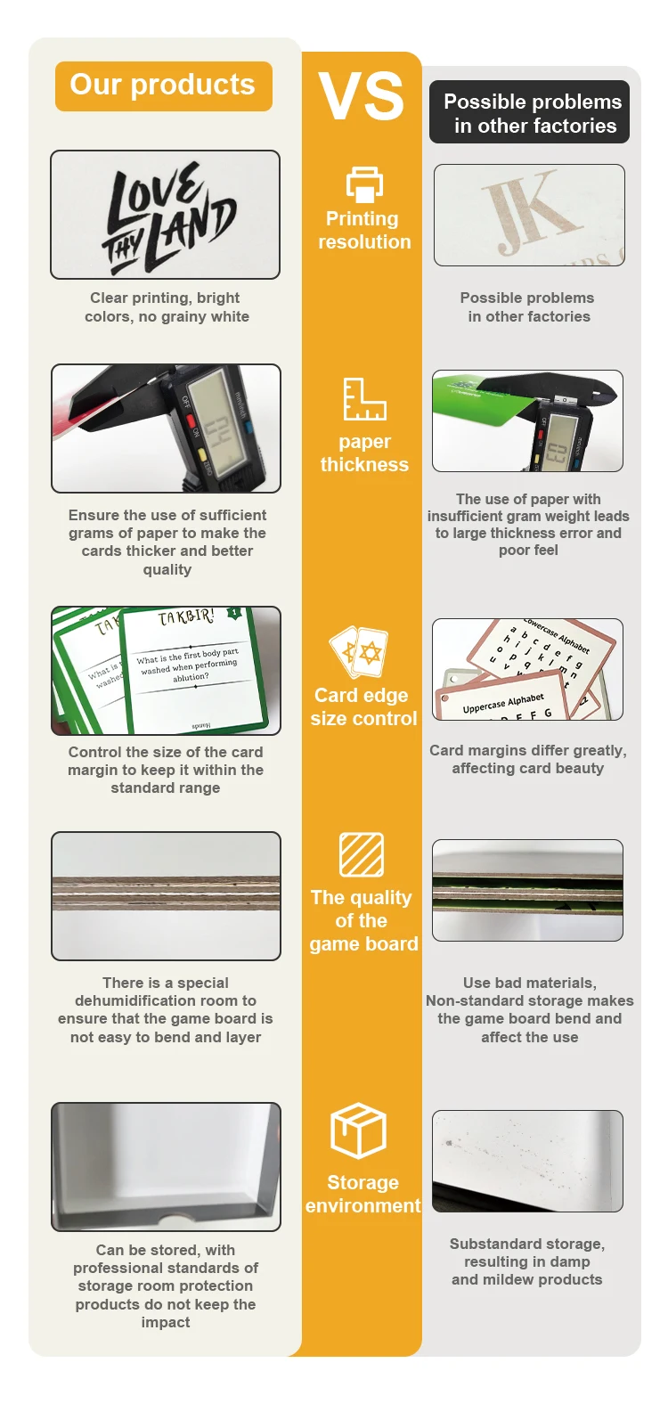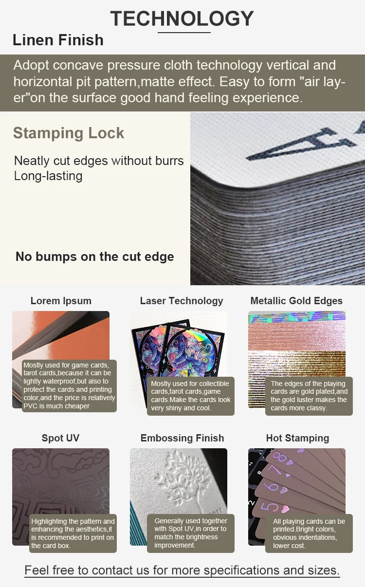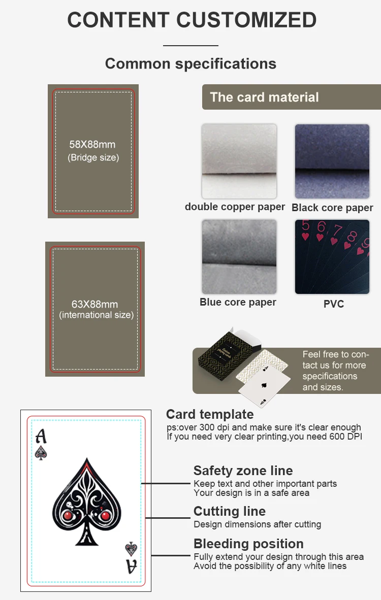 Materials | 250g,280g,300g,350g,400g art paper, white blue core, Waterproof PVC, Linen holo paper, 300g white core paper common use for game card 310 gsm Germany black core paper etc (High quality and a bit expensive, popular use in Gambling) |