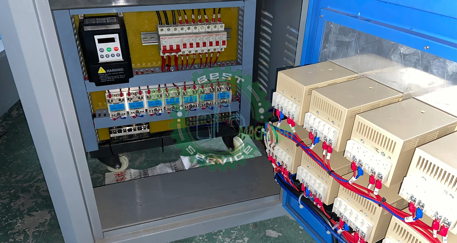Closing cylinder, Sealing cylinder, Stretching cylinder, Closing magnetic valve, stretching magnetic valve, Blowing magnetic valve, Moving magnetic valve, Voltage regulator, Computer controller, Infrared lamp are all from famous brands.