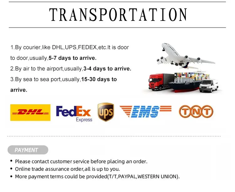 It is available to accept the payments of Alibaba, T/T bank transfer, L/C, Western Union, Chinese Bank, Wechat Pay and Alipay etc.