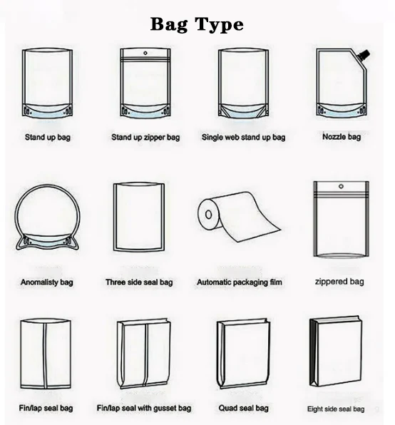 Select your bag type:stand-up bag,zipper bag,three side seal bag,gusset bag,flat pouch,spout pouch. |
