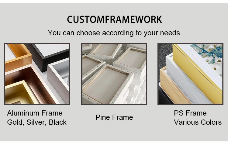 Frame | 1.No Frame :Mean just Canvas (ROLL UP ) 2.Wooden Stretched Frame:Shrink Protective Film + 4 Protective Corners + Carton 3.PS Floating Frame (waterproof MDF backplane add or not )and Aluminum Alloy Frame Multiple choice of colors |