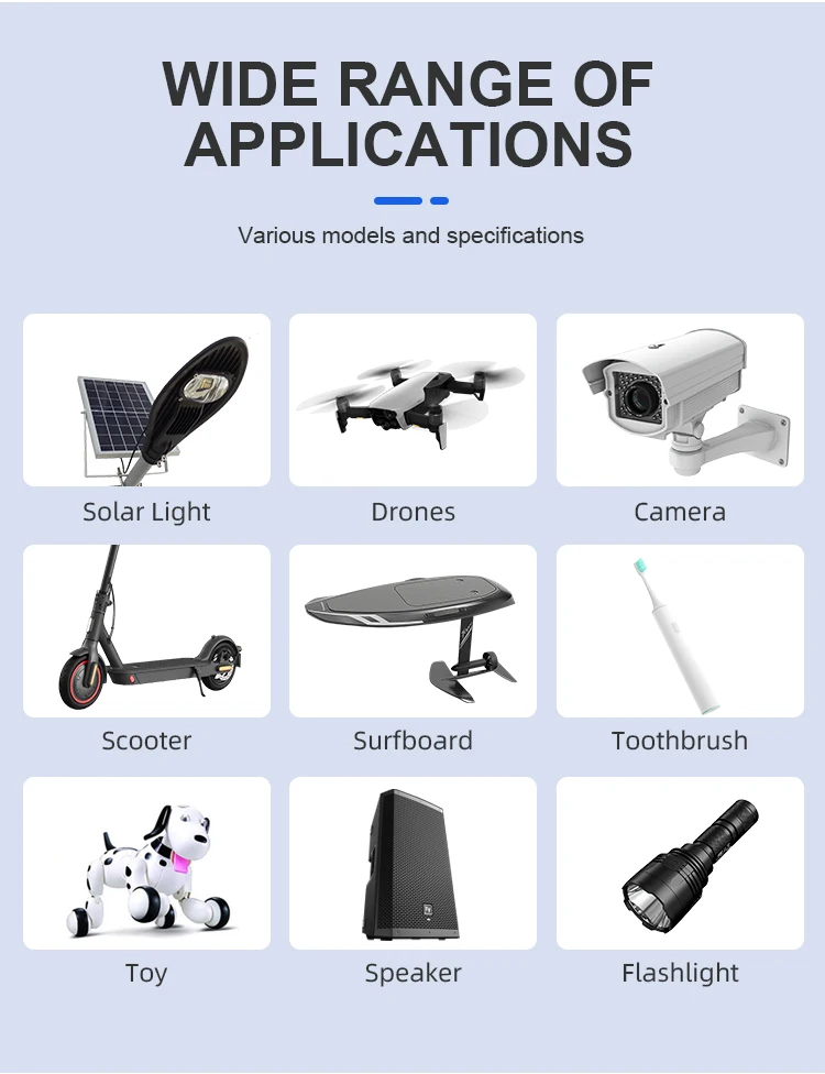 Application | Toys, Power Tools, Home Appliances, Consumer Electronics, BOATS, Golf Carts, SUBMARINES, Electric Bicycles/Scooters, electric vehicles, Electric Wheelchairs, Electric Power Systems, Solar Energy Storage Systems, Uninterruptible Power Supplies, Electric Forklifts |