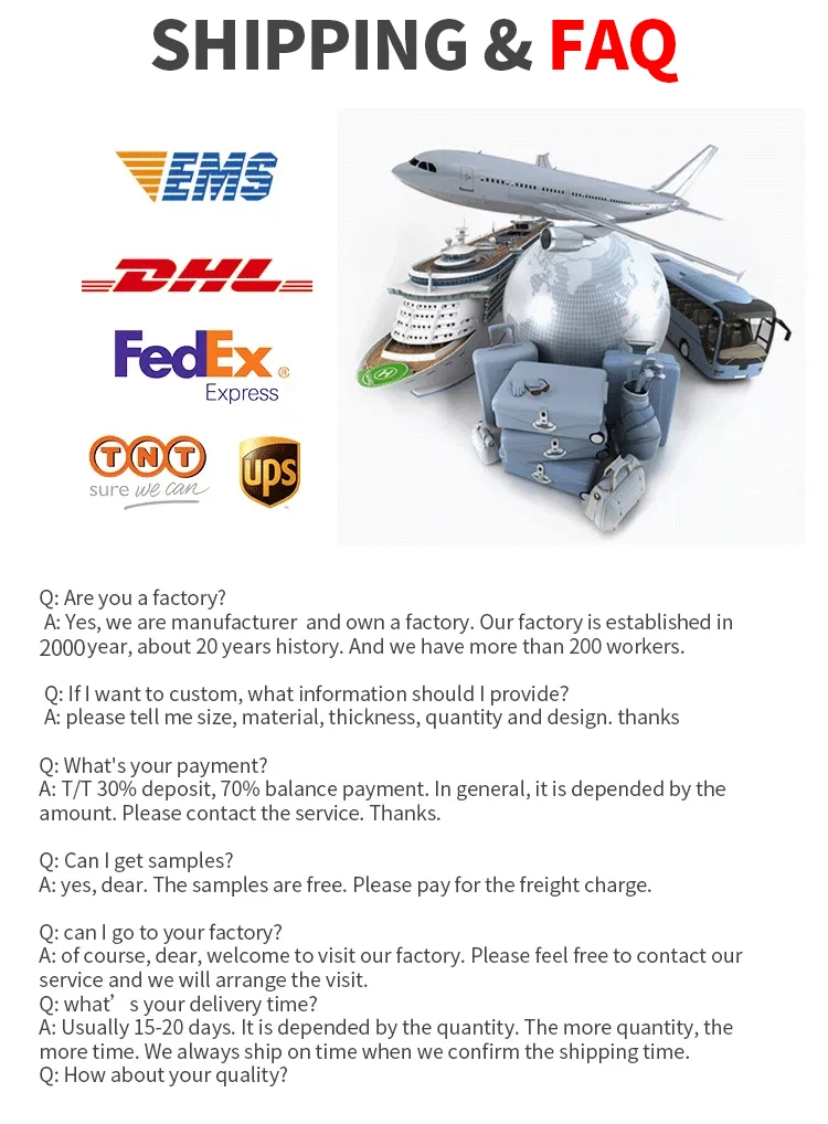 Samples | We provide free spot samples, customized samples will be sent within 15 working days at the earliest after communication and production arrangement. |