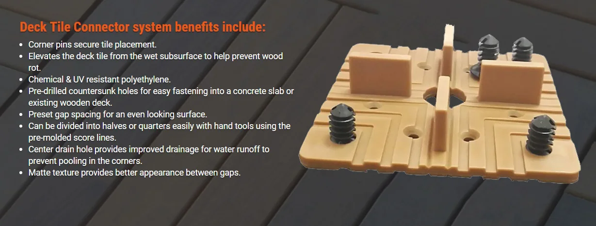 Each connector elevates hardwood deck tiles up off the installation surface for proper water drainage in addition. Each connector comes with 4 ribbed pine tree clips already inserted for quickly snapping into tile fastener holes.