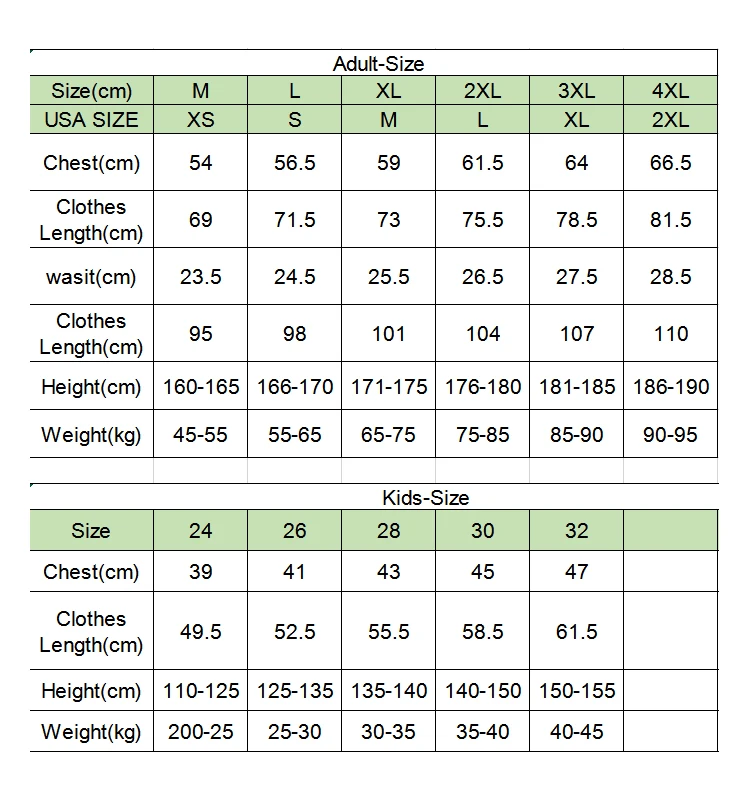 Adult Size | kids( 4xs-xs )S,M,L,XL,2XL(adult European size) L,XL,2XL,3XL,4XL( adult Asian size) |