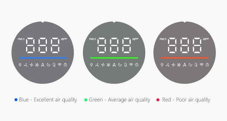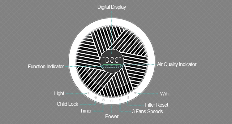 On the device control panel, Three-color air quality indicators are designed, which can automatically change colors according to the quality of indoor air. In the default smart mode at startup, the device's wind speed can be adjusted at the same time, which is more user-friendly Purify indoor air.