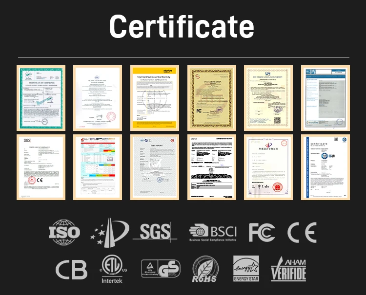Company has passed the ISO9001 quality management system certification, and applied for and passed the BSCI, BV, and SGS organization audit. Products have national appearance patents, CE, ETL, ROHS, FCC, CB, PSE etc.