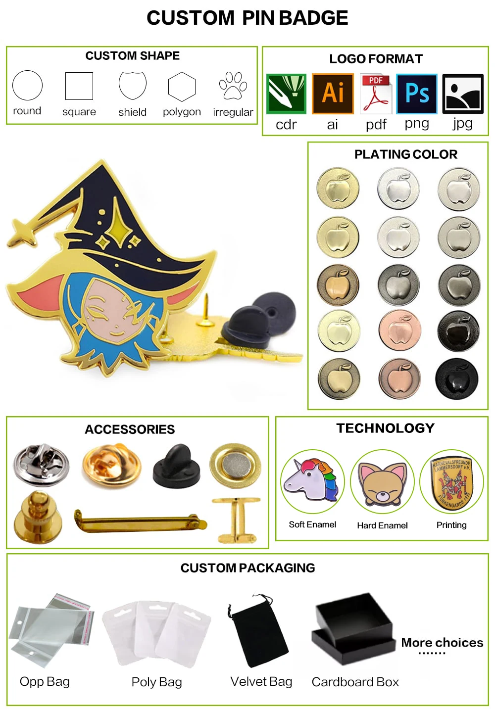 Technology | Soft enamel , Hard enamel ,Printing etc |