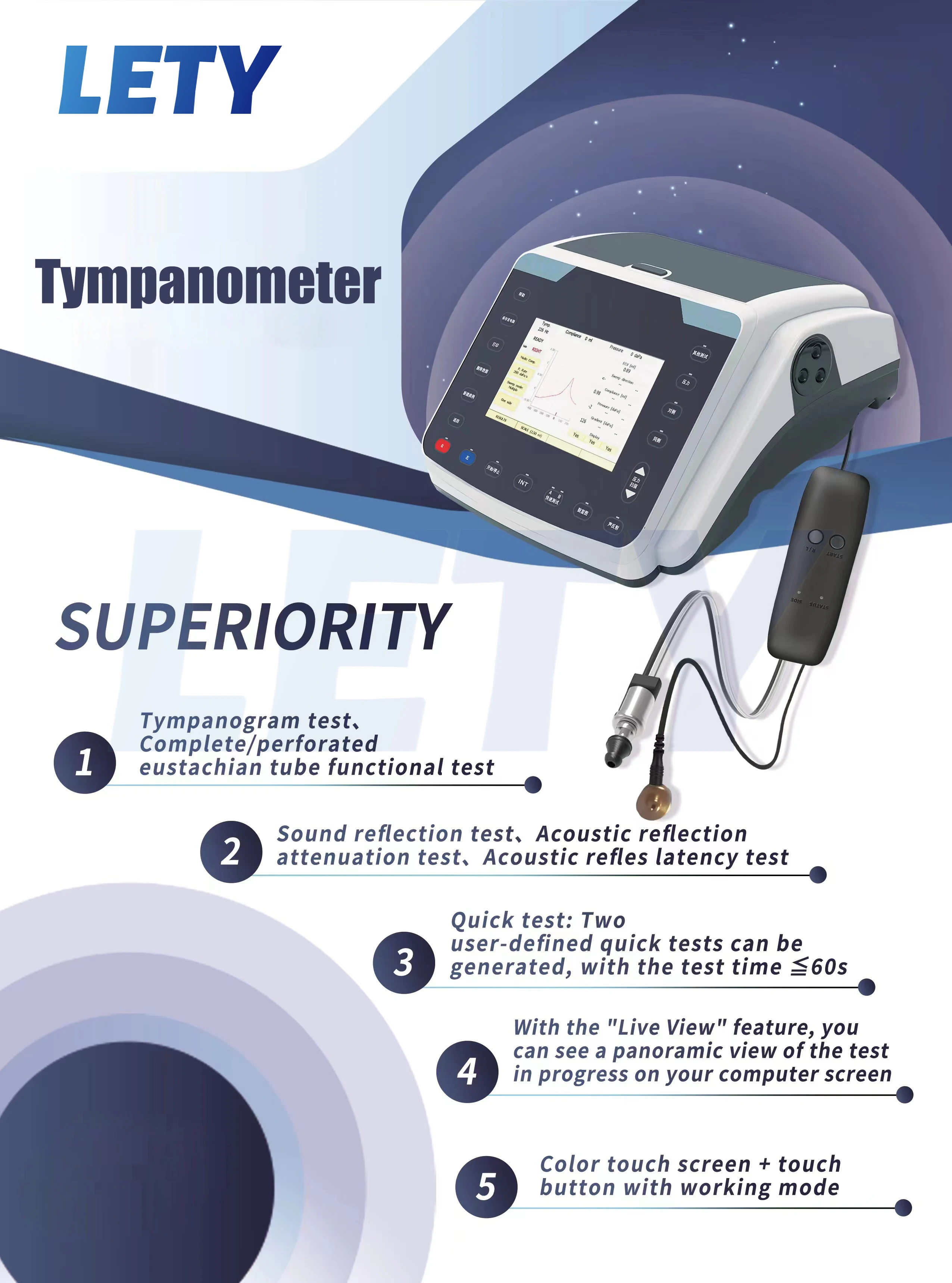 Measuring range | Tympanogram: 0.2cm3-^-5cm3 | ||||||