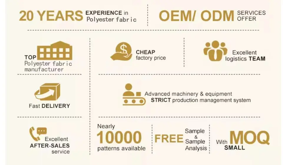 Main products: 100% polyester microfiber fabric, peach skin fabric, oxford fabric,African wax fabric, washed cotton fabric, seersucker fabric, bubble fabric, cationic fabric, taffeta, mini matt, pongee, drop plastic anti-slip fabric, gabardine fabric, poplin fabric, bazin biche fabric, sarong fabric, pearl printing fabric, jacquard satin stripe fabric, functional fabric, bonded fabric, etc.