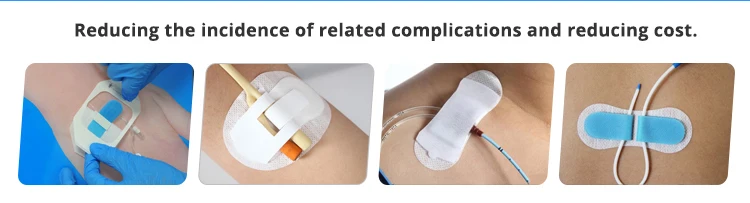 Advantages | 1. Fixed firmly 2. Reduced patient's pain 3. Convenient for clinical operation 4. Prevention of catheter detachment and movement 5. Reducing the incidence of related complications and reducing patient pains. |