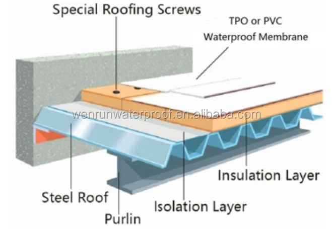 (4) Pre-lay TPO waterproof rolling material. Lay the TPO waterproof rolling material on the insulation layer according to the control position of elastic line, and lay the rolling material perpendicular to the corrugated direction of the pressed steel plate. Lay the naturally loose rolling material on the insulation layer according to the outline.The coil stays flat and smooth.