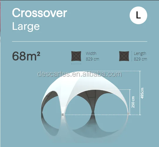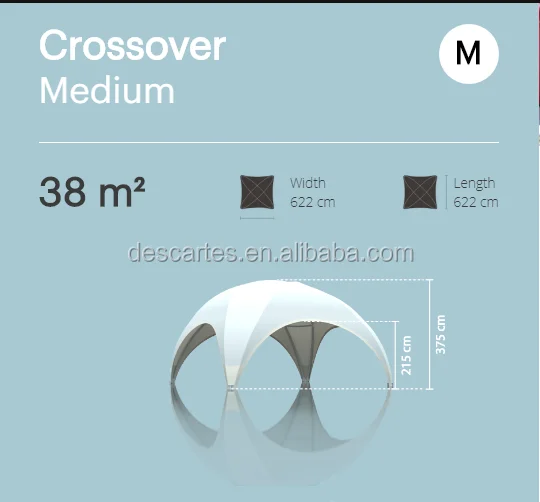 The CROSSOVER dome tent is a futuristic, sustainable and outstanding lightweight tent construction. The strong frame and in-built rigging points allow this very solid structure to take up to 400kg of suspended weight, making it possible to assemble extra attachments like heaters, a sound system or even your favourite Chandelier! Add a truss, screens, speakers, lights, heaters, signage or whatever else you can imagine and the result will be an amazingly spacious structure with masses of floor space. It is a modular product without brace lines and can be connected endlessly on all sides. This allows for large areas with the addition of a connection gutter which can be easily applied by using YKK zippers. The CROSSOVER dome tent is a robust and lightweight temporary event structure that can easily be assembled by two people, the Hexadome Large can be assembled in 2.5 hours using a telescopic lift or crane. As the structure is built from the ground up in layers, the need to work at height is eliminated. Due to the limited size and weight of the components, no tools are required for its assembly and as they are very easy to handle, height and muscle strength is not necessary. Welcome both at home and abroad friends negotiate and contact with me: Skype: sz- descartes WhatsApp & Wechat: +86 15118154988 | ||