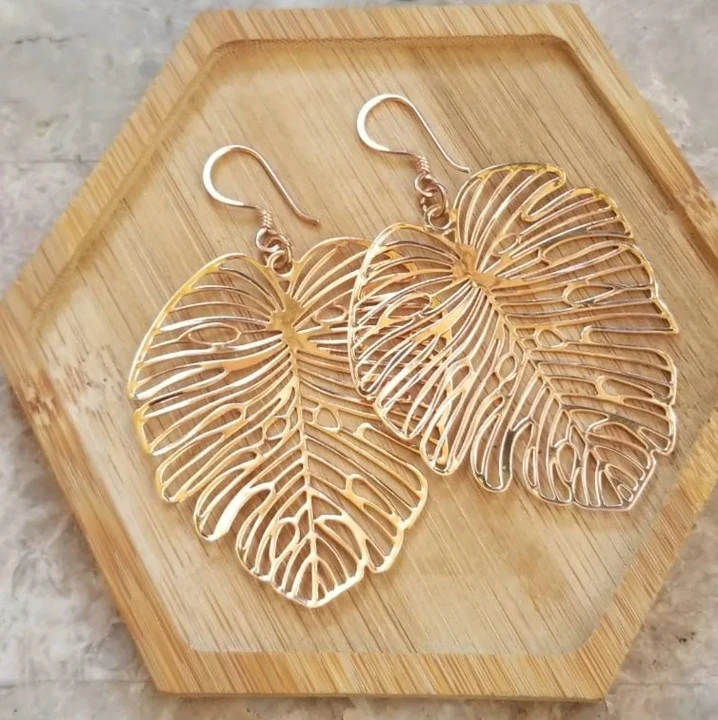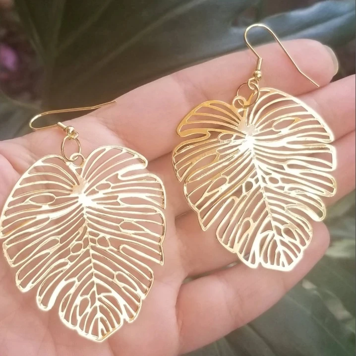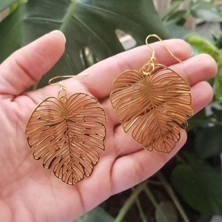 Stylish New Tendency Vintage Tarnish Free Beautiful Waterproof Stainless Steel Jewelry Three Color Plated Monstera Leaf Earrings