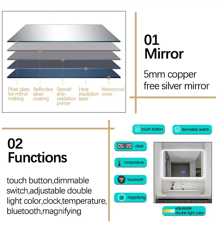 Material | 5mm environmental copper free and lead free silver mirror, anti-corrosion, shatter-proof mirror; | ||||||||