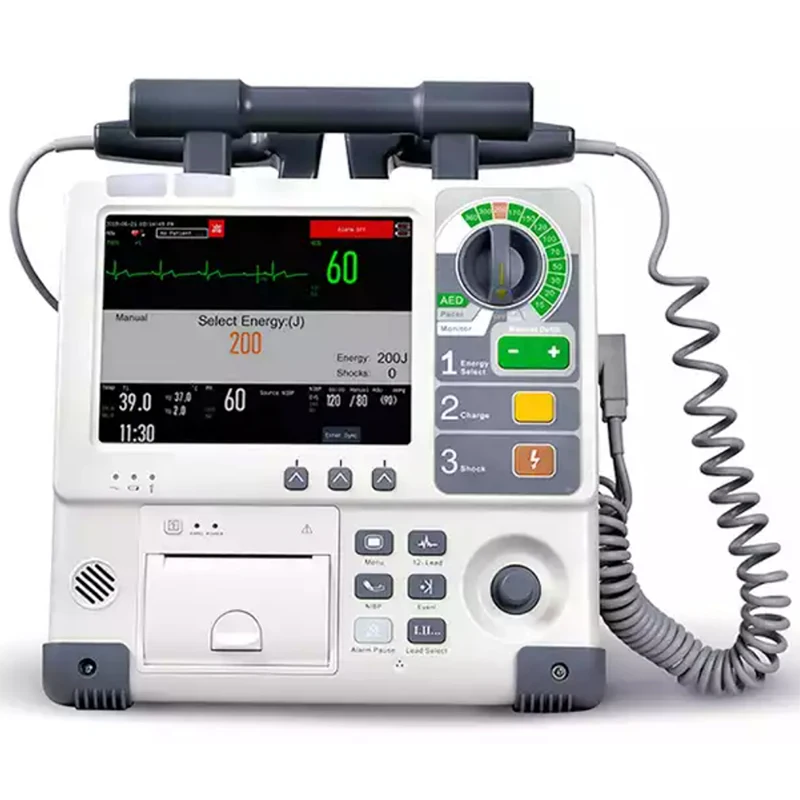 5- lead ECG monitoring as standard, optional monitoring functions include SpO2, TEMP, EtCO2, IBP, and 12- lead ECG are also available for continuous monitoring of patient vital signs. AED: The model applies patented analysis algorithm and automated analysis as well as convenient setting to guide clinical emergency personnel in providing defifibrillation and basic life support.