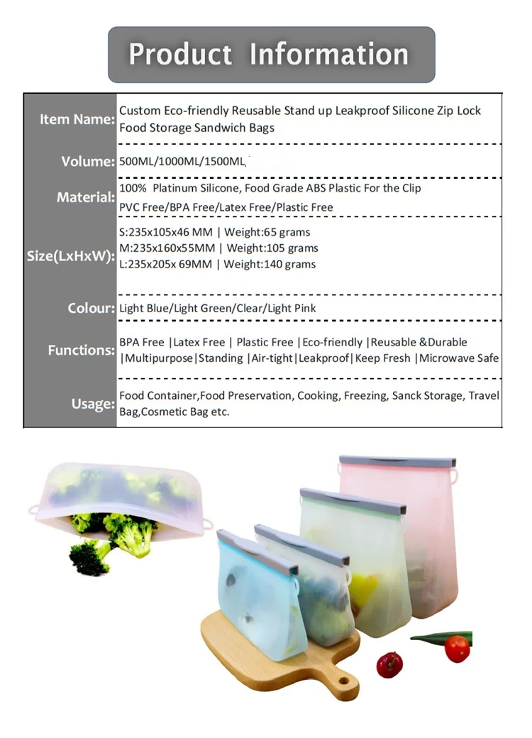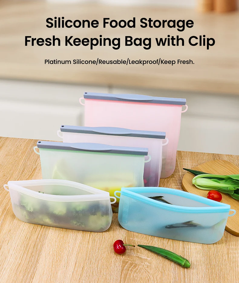 BPA Free Custom Freezer Food Grade Safe Stand Up Foldable Silicon Food Bag Silicone Reusable Storage Food Pouch Bags with Zipper