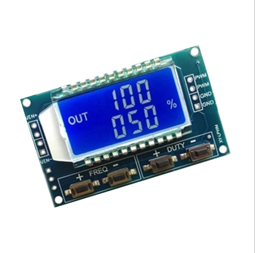 PWM pulse frequency duty cycle adjustable module square wave rectangular wave signal generator signal XY-LPWM Introduction -PWM output, you can set the frequency, duty cycle; 1. XXX (no decimal point): the smallest unit is 1Hz, the value range of 1Hz ~ 999Hz; 2. X.XX (decimal point in the hundred) the smallest unit is 0.01Khz, the range of 1.00Khz ~ 9.99Khz; 3. XX.X (decimal point in ten): the smallest unit is 0.1Khz; value range of 10.0KHz ~ 99.9KHz 4. X.X.X (decimal point in ten and hundred): the smallest unit is 1Khz; value range 1KHz ~ 150KHz e.g. frequency display: 100 indicates PWM output 100Hz pulse; 1.01 indicates PWM output 1.01K pulse; 54.1 indicates that the PWM output has a pulse of 54.1 kHz; 1.2.4 indicates that the PWM output is 124 kHz pulse; Duty cycle range: 0 ~ 100%; All set parameters, power-down automatically saved. Features: LCD display frequency and duty cycle, very clear, PWM output can be set to the frequency and duty cycle; Wide frequency range, high precision; Serial communication, TTL level |